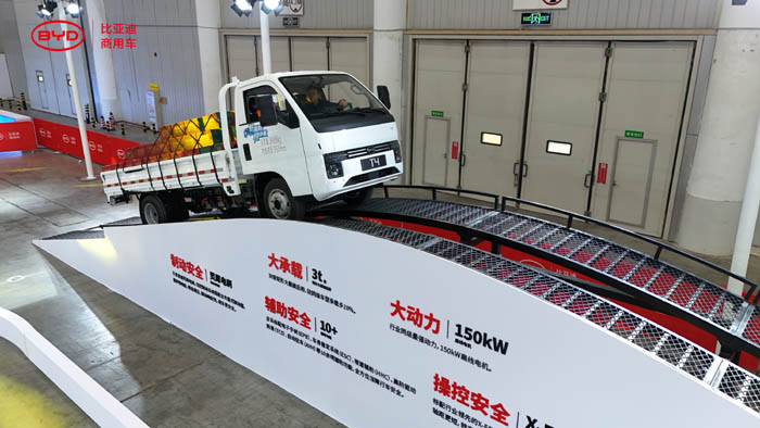 本次参展,是比亚迪首次展出覆盖小卡、轻卡、重卡的全卡车矩阵。其中,全新纯电轿卡T4将于13日全球首发上市,搭载高安全刀片电池,电量62.3kWh,CLTC工况续航里程超330km。动力方面,该车配备150kW扁线电机,204匹马力,340N•m大扭矩,满载最大爬坡度>35%,爬坡更轻松。