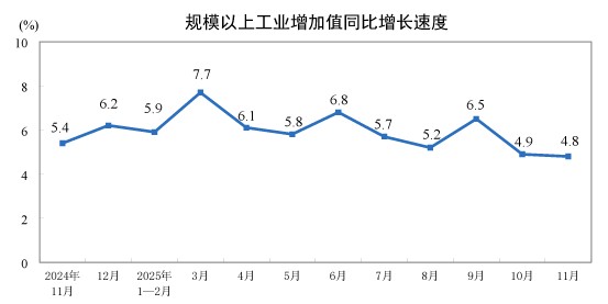 11月份,规模以上工业增加值同比实际增长4.8%(增加值增速均为扣除价格因素的实际增长率)。从环比看,11月份,规模以上工业增加值比上月增长0.44%。1-11月份,规模以上工业增加值同比增长6.0%。