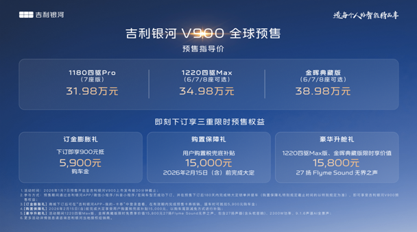 1月7日,吉利银河旗下V系列的首发之作,“AI全场景家庭旗舰MPV”——吉利银河V900正式开启预售,共计3个版本,预售指导价格区间为31.98万元~38.98万元。新车围绕中国大家庭出行的真实需求,以宽奢空间、豪华驾控、全维安全、AI智能几大全能满配实力,重新定义豪华旗舰MPV价值标准,树立AI全场景豪华出行新高度。