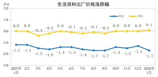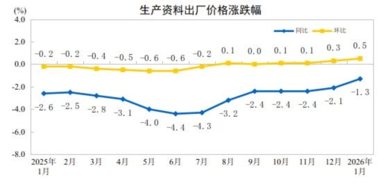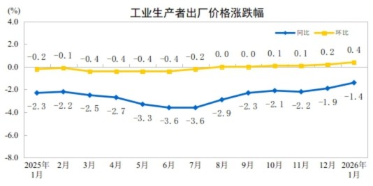 2026年1月份,全国工业生产者出厂价格同比下降1.4%,降幅比上月收窄0.5个百分点;环比上涨0.4%,涨幅比上月扩大0.2个百分点。工业生产者购进价格同比下降1.4%,降幅比上月收窄0.7个百分点;环比上涨0.5%,涨幅比上月扩大0.1个百分点。
