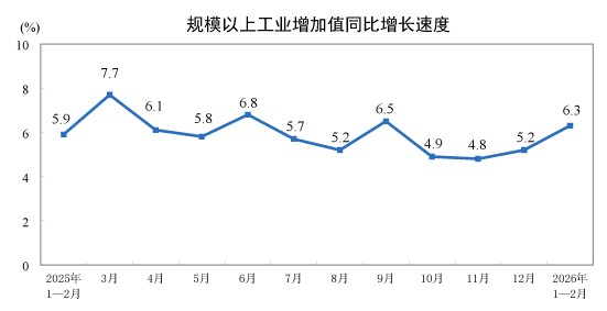 1-2月份,规模以上工业增加值同比实际增长6.3%(增加值增速均为扣除价格因素的实际增长率)。从环比看,2月份,规模以上工业增加值比上月增长0.83%。