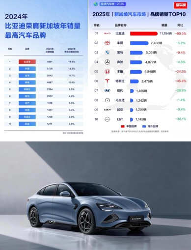 近期,据新加坡陆路交通管理局数据显示,2025年,比亚迪乘用车在新加坡销售11184辆,同比增长80.6%,蝉联年度全品牌销量冠军,彰显领先的新能源技术实力。自2022年,比亚迪正式进入新加坡乘用车市场,仅用两年时间成功登顶榜首。
