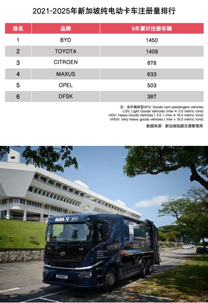 在电动卡车领域,比亚迪于2020年进入新加坡,开始向当地正式交付环卫车T9,成为当地第一家销售电动卡车的公司。2021年-2025年,比亚迪纯电卡车在新加坡五年累计注册量达1450台,排行第一。