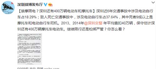 据@深圳微博发布厅消息,深圳近6年交通事故中涉及电动自行车占18.29%;致人死亡交通事故中,涉及电动自行车占37.64%,其中死者9成以上是摩托车和电动自行车司机。2013、2014年深圳交警年平均查扣40万辆,保守估计深圳还有400万辆摩托车电动车。继续限行还是松绑严管?你怎么看?