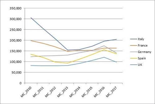 值得注意的是,法国和意大利市场,目前销量还没接近金融危机前的水平。实际上,两个国家的2017年摩托车销量仍远低于2010年的水平,而英国的销量远高于金融危机前的水平。
