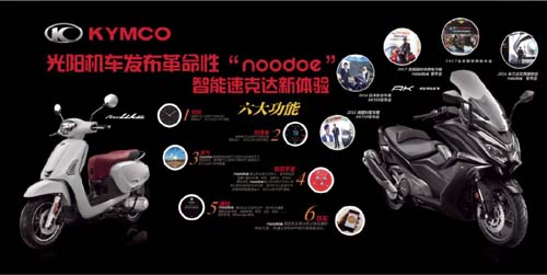 2017年光阳推出了以骑士为中心的KYMCO光阳智联网Noodoe仪表,具有时间、时速表、天气、智慧罗盘、通知和寻车六大功能为一体的Noodoe仪表,为光阳2017年的重磅产品AK550、Any Like 150(Noodoe版)、People S 150(Noodoe版)增色不少。