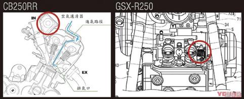 以外,节气门的进气路径也值得注意,现行款GSX250R采用的是从车尾水平进气的结构,但GSX-R250则是采用了从上到下的下沉式进气,且因为是直线式的进气路径,所以能让引擎的进气效率提高。