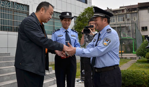 副县长、县公安局局长谢久文为消防车辆管理单位授车钥匙