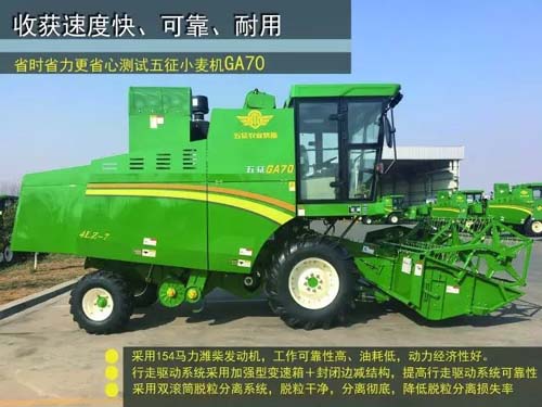 五征GA70谷物联合收获机是在总结国内外同类产品,集众家之长的基础上,研制开发的一代产品,以收获小麦、水稻为主,五征谷物联合收获机械以卓越的品质、优良的性能,便捷的操纵,带来收获的享受!这样一个效率高、效果好,一机多用,适应性强的五征GA70稻麦收获机你心动吗?